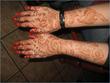 This is the same hand but the back side. This was 4 days later after I put the mehndi on so its already started to fade by the fingers. I guess it has something to do with our blood circulation. What I have noticed is that the color does come out dark but it takes its time. In my case even an arm band comes dark but it takes thrice the time to show the right color. For eg. my palms get the right color after 36-48 hrs. The rest of the body takes more than 48 hrs. In fact whatever the occasion is I always put mehndi 2 days b4 rather than 1 day. Palms for some reason start getting dark right away. Other parts of the body take their time.