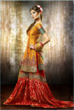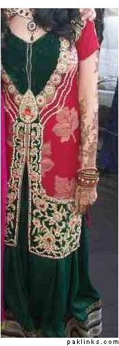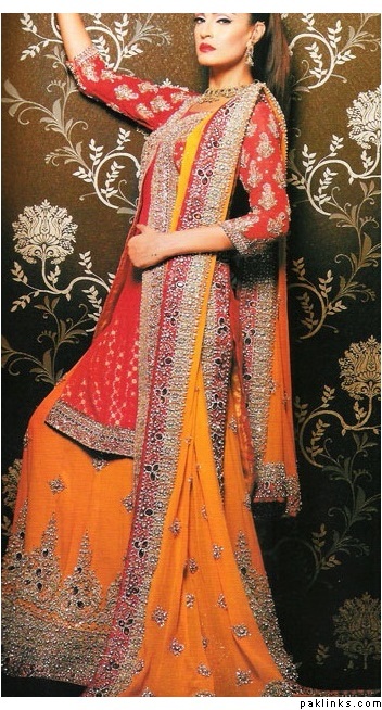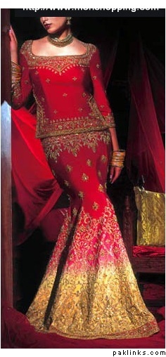 u can get a idea from this not a very clear pic but the bride is i think wearing her mum or someones wedding gharara n amde yellow n red shirt n its looking nice