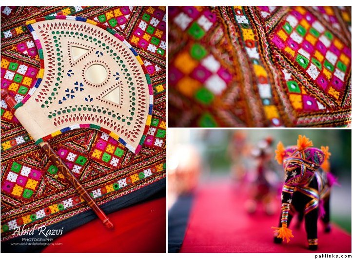 What we did - we draped along walls sequins kappra (thank god for velcro), decorated the stage & built a backdrop - from spandex kappra covered by sheer shimmer kappra in matching colors, used a swing from a friends house as the seating strung with flowers, all tables had satin colored tablecloths, center piece were- deco beads- multiple colors- in a simple vase with a light inside so it glowed at night, cocktail tables with sequin kappra, floor decor- decorative pillows surrounding dholak⦠gathering supplies took a few months but set up about 6.5 hours with about 8 of us working on everything.