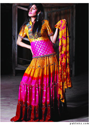 its a shalwar kameez tie dye orange and shocking pink with a shocking pink shalwar and the kameez and dupatta have that gota ka kaam ill post pics when i can :)