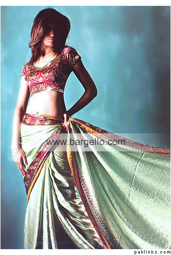 Another outfit i saw (and cant post obviously), an olive green and coral-colored gharara with touches of golden. absolutely gorgeous…the bust or bodice was in coral with lots of kaam on it and the rest of hte outfit in olive green, with golden/copper colored kaam on th chaaK and daman. it was a deep square gala with cap sleeves, and a patch of fabric on top with straps, kind of like the tank-top effect know what i meaN? duputta was golden with peach tye dyed at the bottom with a simple kaam-wala border and the gharara was coral/peach colored, very simple… i know it sounds strange i wish i could post the pics but cannot…but it was really nice. Oh and she also wore a jhumar-style tikka and some other jewerlery was pinned to her up-do, it looked really nice..of course