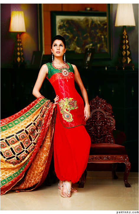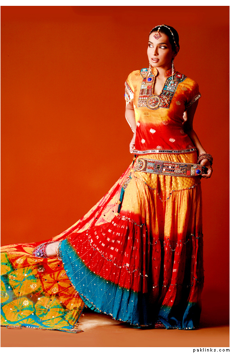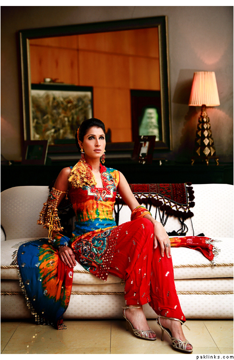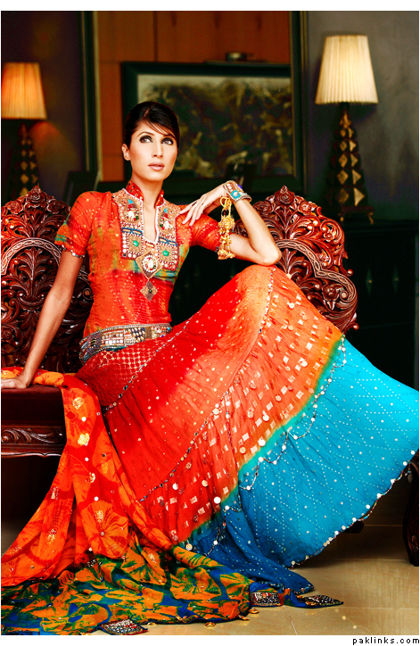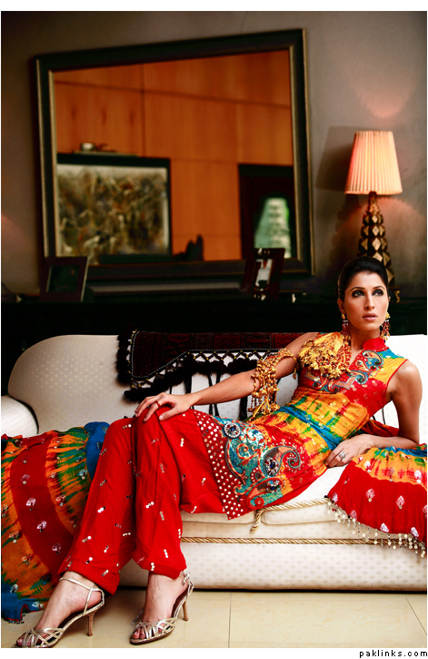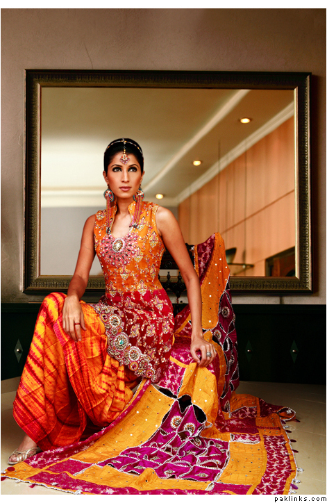 THeres lots fo nice color combos u can do now… turqoise is still popular, if u want to be a little less traditional, red and turq is nice for a mehndi (not just a bridal). Also emerald green with hot pink is nice, and i really liked this outfit i saw.. she was wearing yellowish and coral/salmon colored gharara…