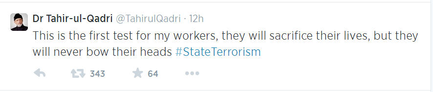 Responding to the use of force against his party workers, Qadri said he protests police brutality against the peaceful demonstrators. He further accused the government of using this issue to divert attention from the ongoing operation in North Wazirisitan. While speaking to media, Qadri said the police action was unjustifiable as the barriers were placed on government’s order many years ago.