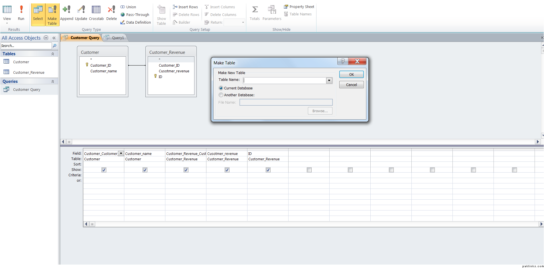 Here is a query from Access on 2 tables that have the customer_id common between the two. I have Access 2010 and I clicked on Create tab and clicked on Query Wizard to bring up the wizard when I selected everything from the tables it asked me to create the relationship and once I did that I defined the relationships I went back to the Create Query and Query Wizard and was then able to create a query. Here is the SQL Version of the query.
