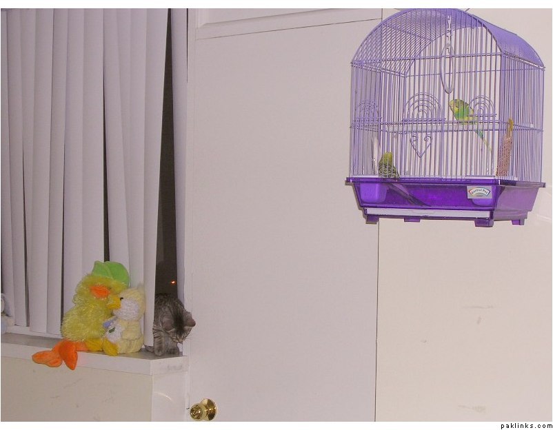 lol tried hard to get birds ( birds baycharay cheekh cheekh kar laal peelay) and then tootise jumped .. cage upside down .. when I saw the cage.. there was only one parakeet in there and other one was gone lol looked everywhere and couldnt fine the other one. Grabbed tootsie and made sure to see any sign of feathers around here. Nothing Nada! LoL went back to the cage .. por lil parakeet was stuck between the tray of the cage