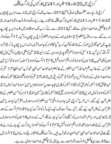 Last night 3 ulema qari imran,Moulana Saifullah Barmi , Moulana Samiullah and another Muhammad ali were martyred. Media should not focus on the killing of just one sect but should present a balanced approach