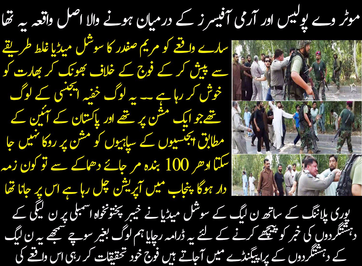 because the fact is that army folks are wrong in this episode. we pakistanis know our motor way police well. many times interacted with them. they issued tickets to my brother as well. they are always very respectful and professional. so why in the word, they will pick up fight with army officers? and pics are telling the whole story