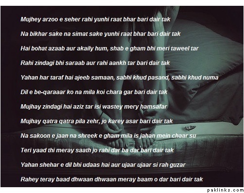 **Mujhey arzoo e seher rahi yunhi raat bhar bari dair tak