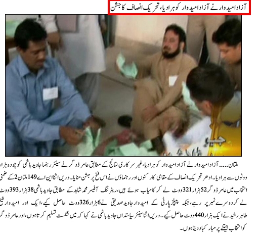 As for this result, Hashmi made some outrageous claims at the behest of his old friends and joined hands with all sort of parties he pretend to stand against. Likes of Maulana Fazal gave him full support along with all religious parties (so called custodians of democracy). PTI supported someone who had no chance to win in normal circumstances and managed to defeat someone in politics for decades which is a huge achievement.