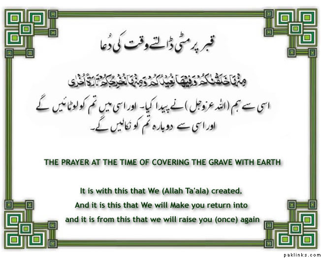 -2- Wa’ilah ibn al-Asqa reported: “The Prophet, peace be upon him, led us in a funeral prayer for a man from among the Muslims. I heard him saying: Allahumma inna fulana ibna fulan fi zhimatika wa habla jawaraka, fa-qihu min fitnatal qabri wa azhabin nar wa anta ahlal wafa’ wal haq, allahumma faghfirlahu war-rahmhufa innaka antal ghafurur Raheem. ‘O Allah! So-and-so, son of so-and-so, is under Your protection and mercy, so protect him from the trial of the grave and the torture of Hell Fire. You are the guardian of the truthful and the faithful. OAllah! Forgive him and be merciful to him, as You are the Most Merciful, Most Forgiving’.” Narrated by Ahmad and Abu Daw’ud.