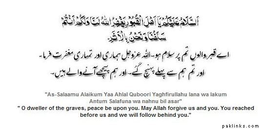 "As-Salaamu Alaikum Yaa Ahlal Quboori Yaghfirullahu lana wa lakum