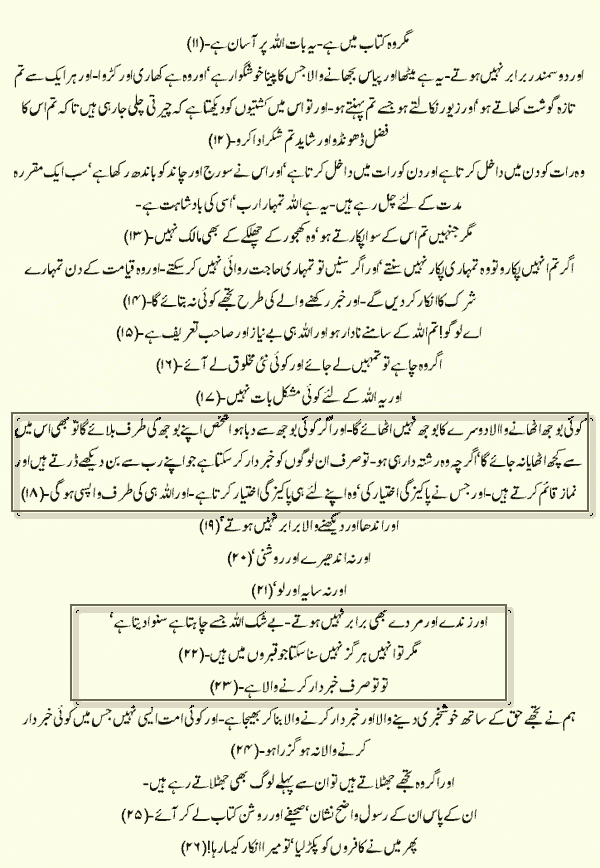 **23. **You (O Muhammad:saw2: ) are only a warner (i.e. your duty is to convey Allah’s Message to mankind but the guidance is in Allah’s Hand).