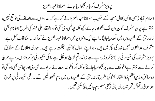 [RIGHT]اسلام آباد ( مانیٹرنگ ڈیسک) سابق فوجی صدر پرویز مشرف کی بیرون ملک روانگی کی اطلاعات نے زور پکڑ لیا ہے اور غیر سرکاری طور پر ان کے بیرون ملک جانے کے انتظامات کی.[/RIGHT]