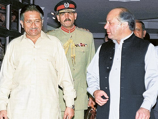 Former prime minister Nawaz Sharif with Pervez Musharraf in this July 4, 1999 file photo at the air force base in Rawalpindi.