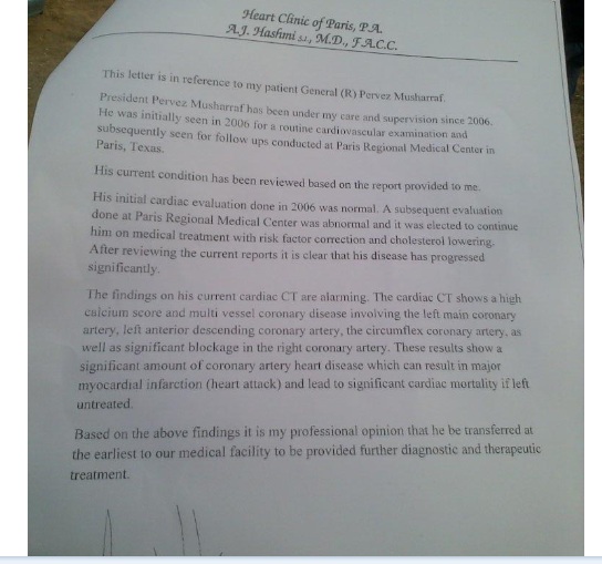 Musharraf has yet to appear in person before the specially-convened three-judge tribunal, missing hearings due to security fears and the health scare.