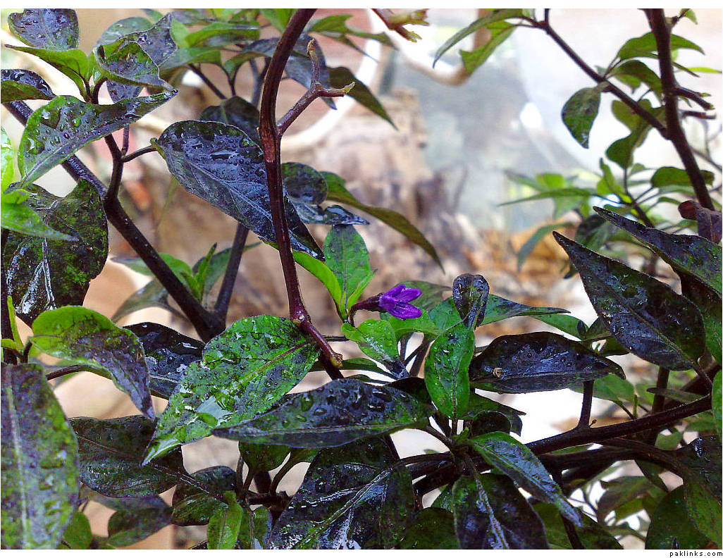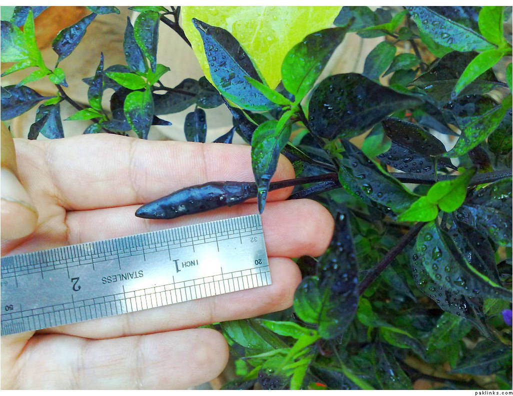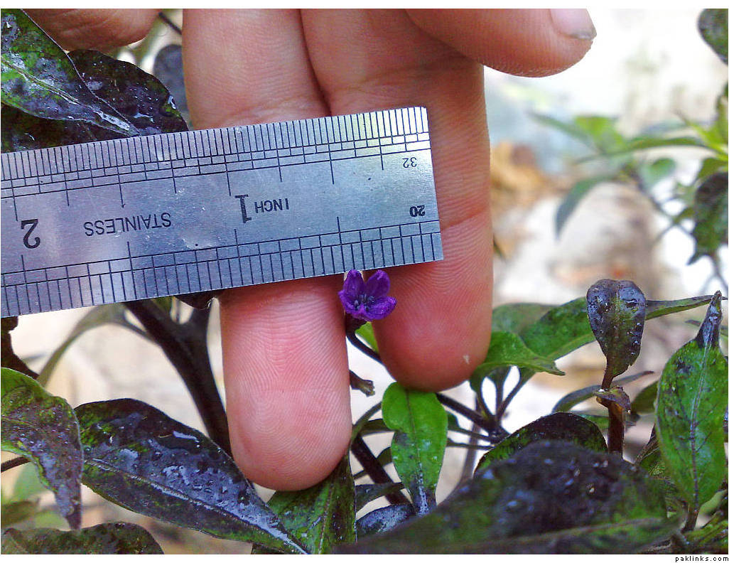 The chili usually grows to about an inch in length. Color of the flower and the young chili is always purple, but when it matures (in about a week to 10 days) - It becomes a blazing red bomb! It also turns a greenish-brown between transition, but that state only lasts for a day. So it’s mostly purple, which quickly jumps to red.