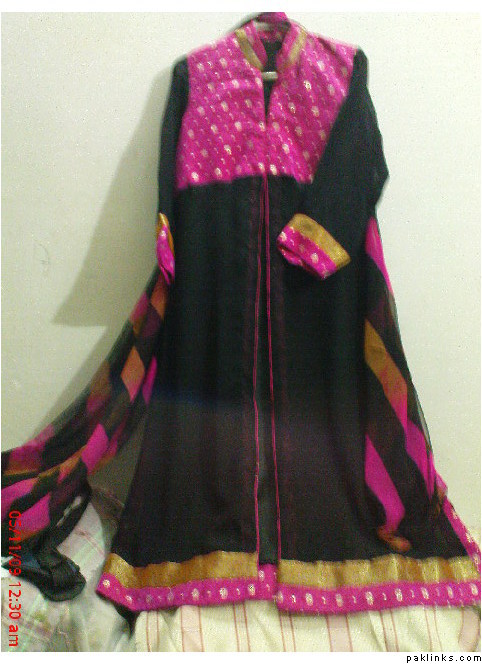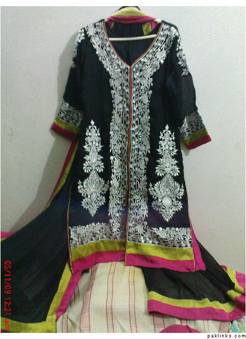 Designer wear black chiffon two piece shirt with tie and die duppta and raw silk pants withh all banarsi patties on shirt duppta …rs.5500