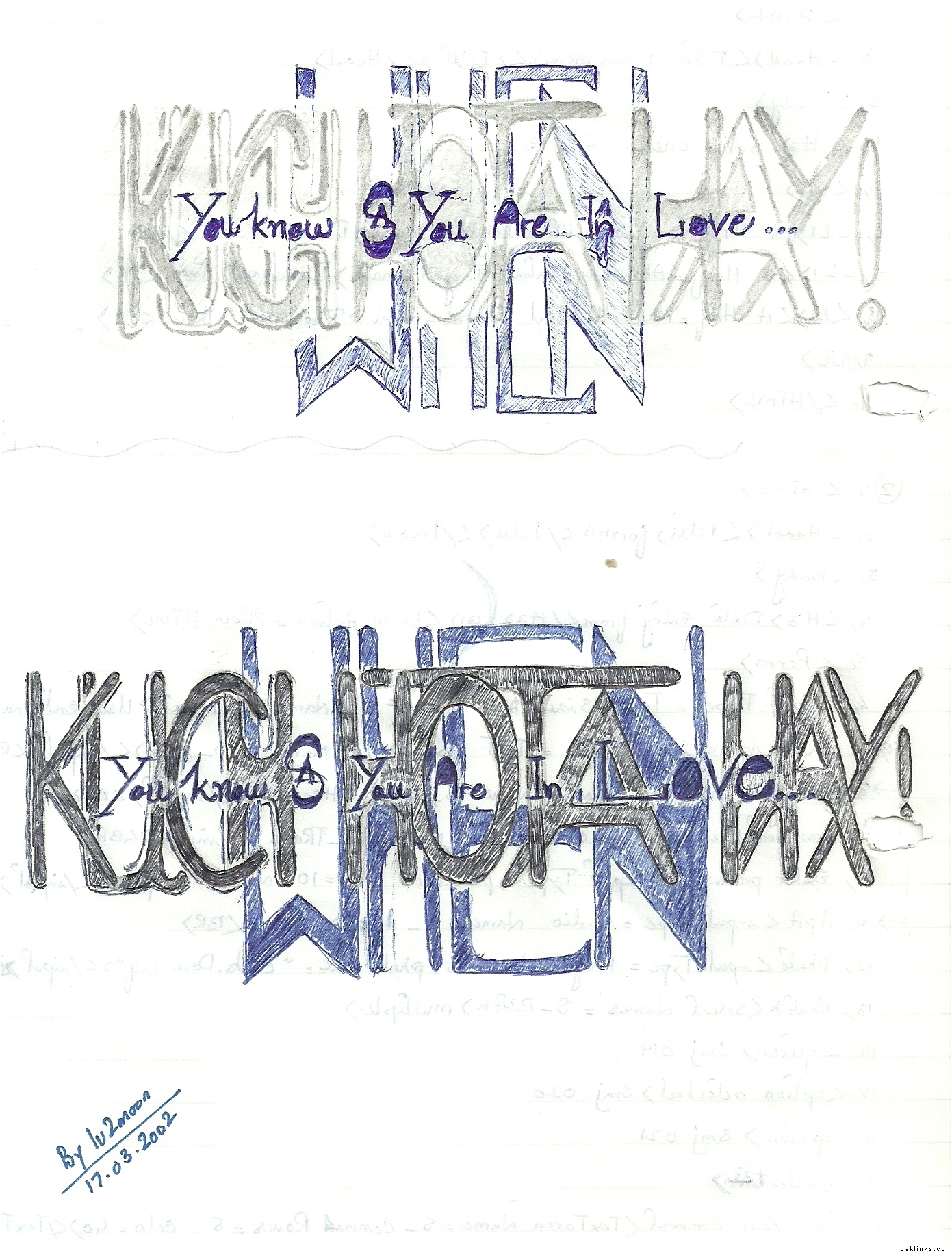 Nice but i wrote here When kuch kuch hota hay You know (A) or (S) you are in love!!! A and S ko mentioning! :D i never thaught ke 'as' ban jay ga hehe lol