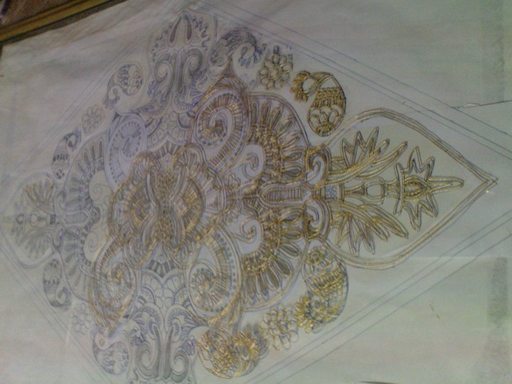 next is to use glass paints .I decided not to go with transparent ones because the one i had done preciously has faded away with years and i believed this design would look prettier with something opaque .then paint ,paint and paint.
