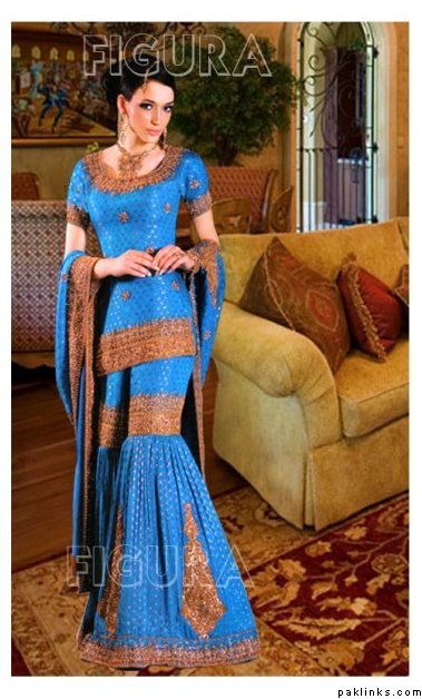 the “flare legged” gharara is pretty but it doesn’t seem like a bridal lehnga… they look like pants, like one of the guests would wear to my wedding! it literally looks like the blue outfit picture!
