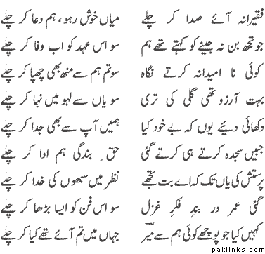 Na Zahir Ho Tumhari Kashmakash Ka Raaz Nazaro.n SeTumhein Bhi Koi Uljhan Roki Hai Paish Qadmi SeMujhe Bhi Log Kehtay Hain Keh Yeh Jalway Paraaye HainMere Hamrah Bhi Ruswaaiyan Hain Mere Maazi Ki**Tumhare Sath Bhi Guzri Hui Raaton K saaye Hain **