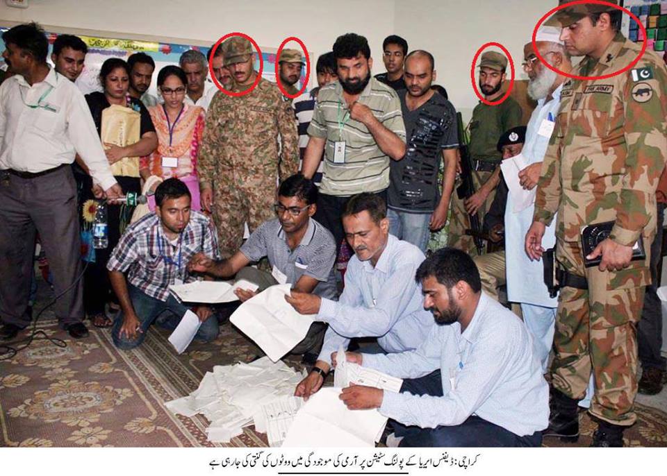i remember on the election day in a couple of polling station rangers guys went inside for something (i don't know what) and MQM called a press conference on it that "army polling stations kay andar dakhil ho gaiee hay, ab election kesay fair hoga" in my opinion army/ranger should only be provided for security outside, not inside. For inside transparency and fairness, CCTV Camera + electronics polling + more accountability is the way to go, not deploying rangers or any other force. They are after all humans, they have their families and they have their own "needs" they can be bribed and threatened etc etc. on the other hand a Camera or computer doesn't have a throbbing heart : )