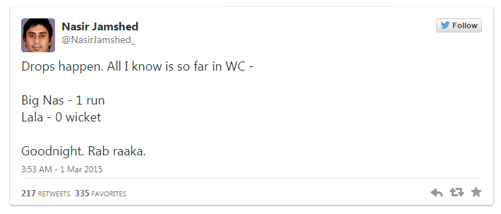 **And yet whatever our win/loss record, there’ll still be the comedic gold of the Nasir Jamshed satirical Twitter account. Nasir’s fictional travails — in all their bemused, confused, ball-dropping glory — have been immortalised on the internet.