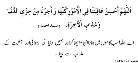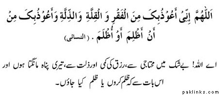"AY ALLAH TU HUM KO ISS BASTI KEY SAMRAAT-O-MUNAFA ATTA FARMA AUR ISS BASTI WALON KO HAMARI MOHABBAT DEY AUR ISS KEY NAIKO KAAR BASHINDON KI MOHABBAT HUM KO NASEEB FARMA, JAB MEI POHANCH JAAON APNI MANZIL PEY, MEI ALLAH KEY KALMAAT-E-TA'AMMA KI PANAH LAITA HOON HAR USS CHEEZEKEY SHARR SEY JO USS NE PAIDA KI"