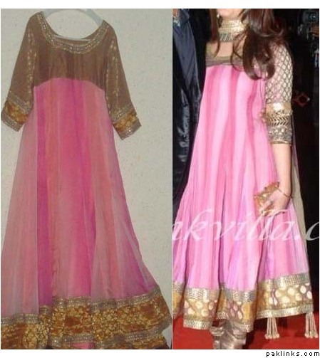 Is this all you could do to make this dress closest? My question is that why didn’t you use a good brocade material for the top part of this dress, which is exactly what she is wearing. Why did you use a tissue fabric and was it fair to give me a tissue fabric instead of the original fabric used? Proto, aren’t you aware of what cloth is what? And please don’t tell me you only found this kind of banarsi to be used on this dress, when I specifically said I want alike border. Pakistan has a lot of variety, and one can easily find these materials, if they want to. This dress doesn’t have any embroidery on it; therefore the main attention should b given to the border, panel, and the top part of the dress and these should have been done nicely. Pls don’t forget that I also mentioned to you to please get things arranged and make it so that it looks good. I am sorry to say but this dress doesn’t look good at all.