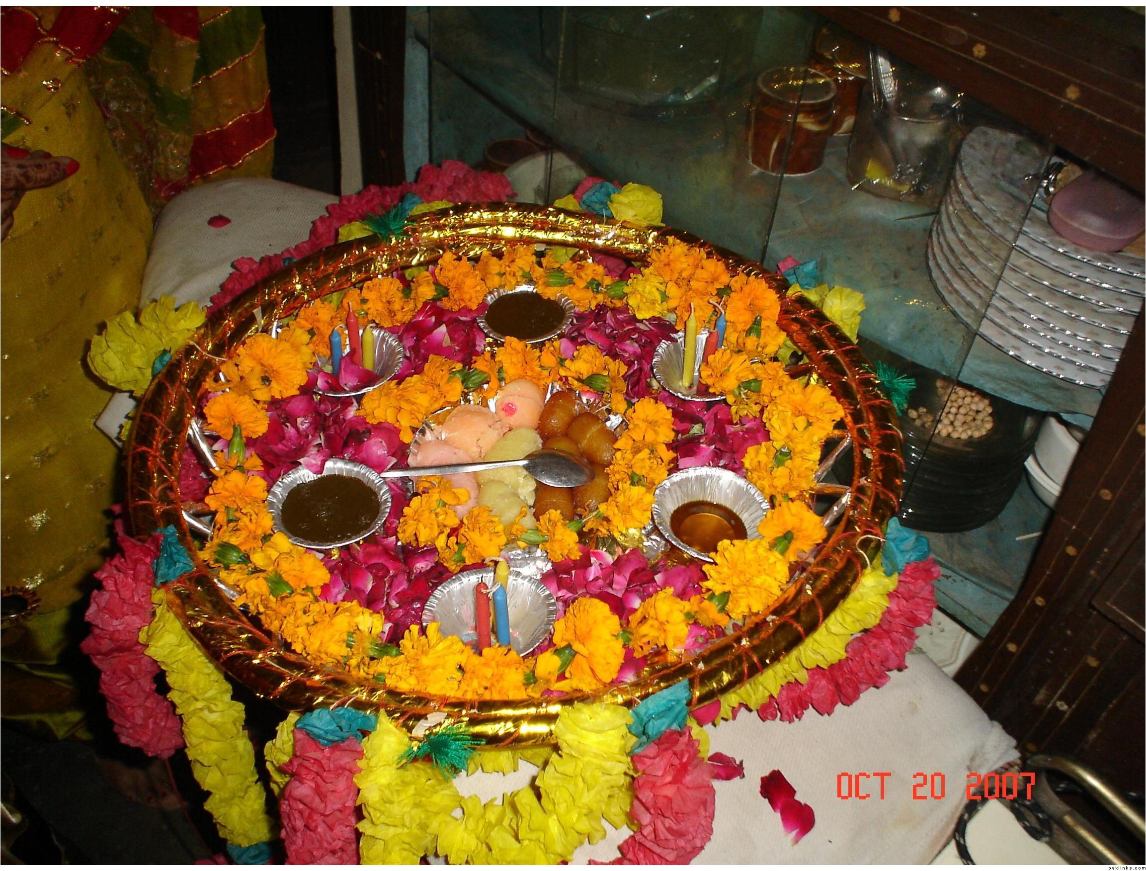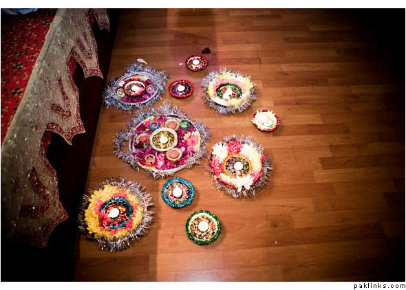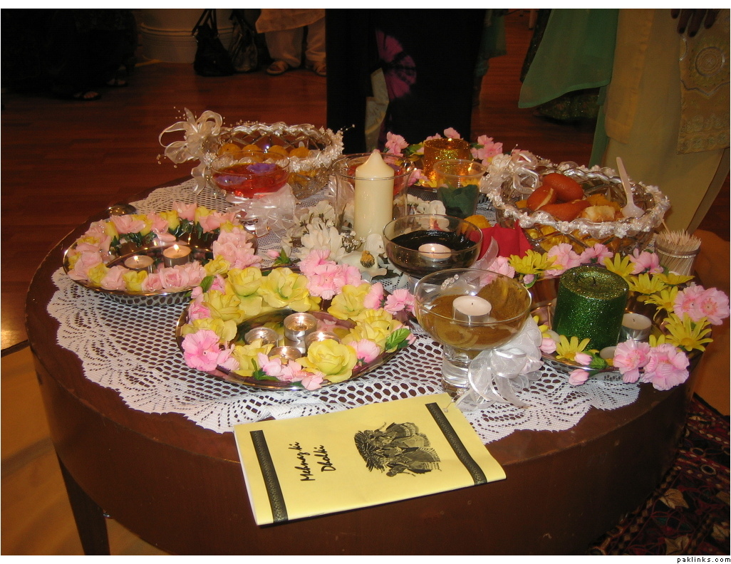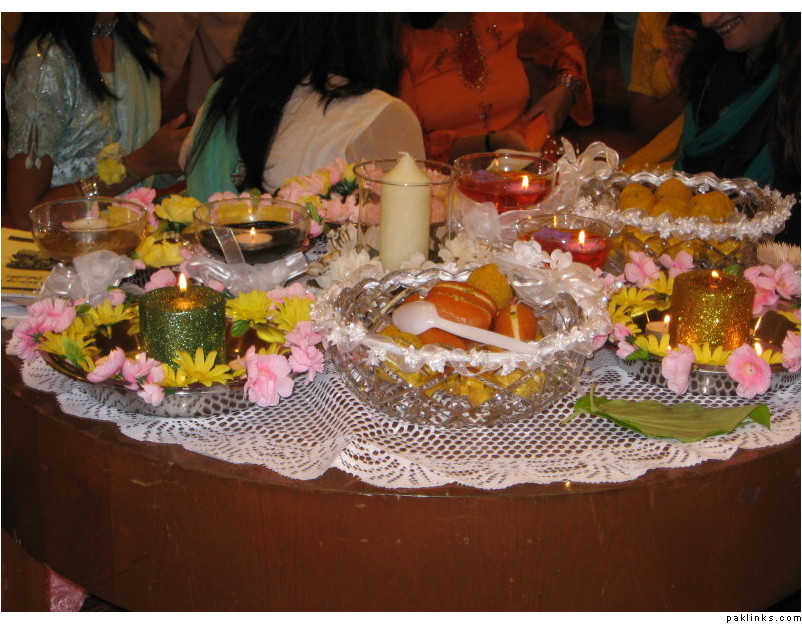 Most of the stuff we used were made by my Afghani friend. In their culture, they use crystal bowls/cups/plates … and decorate it with white lace and ribbons. So she got all of that from Michael’s. They actually use those for the wedding rasms, but since my wedding was overseas, she made them for me for the dholki. I’m supposed to keep these forever and use them too. The rest of the tin trays I got from the dollar store and decorated with plastic flowers … I will upload a few pics.
