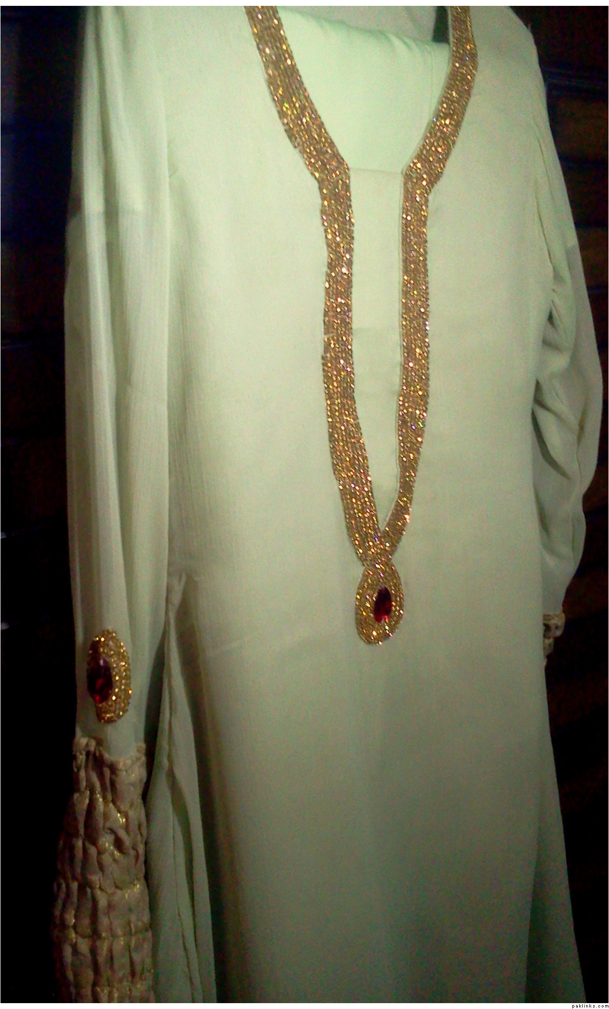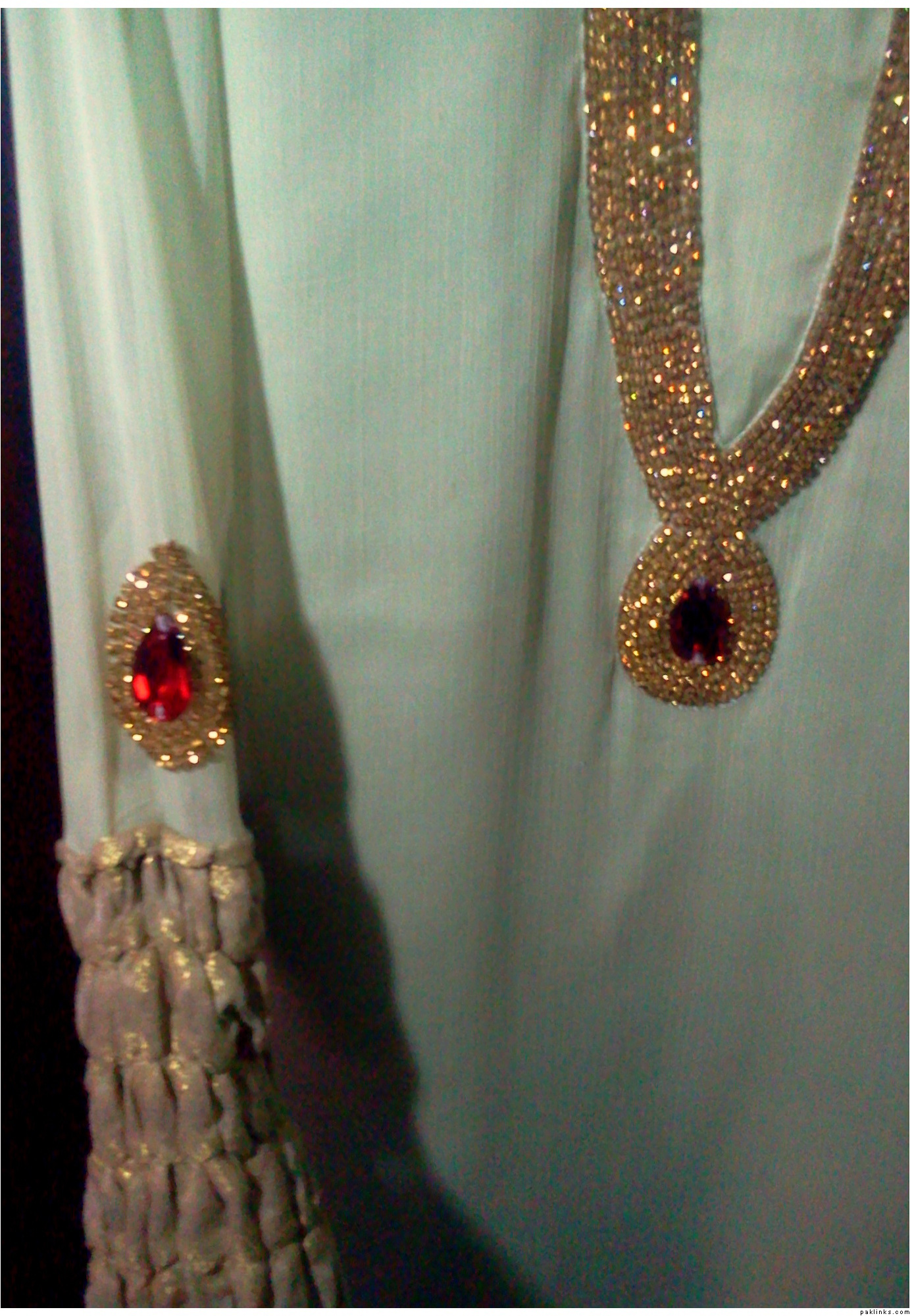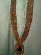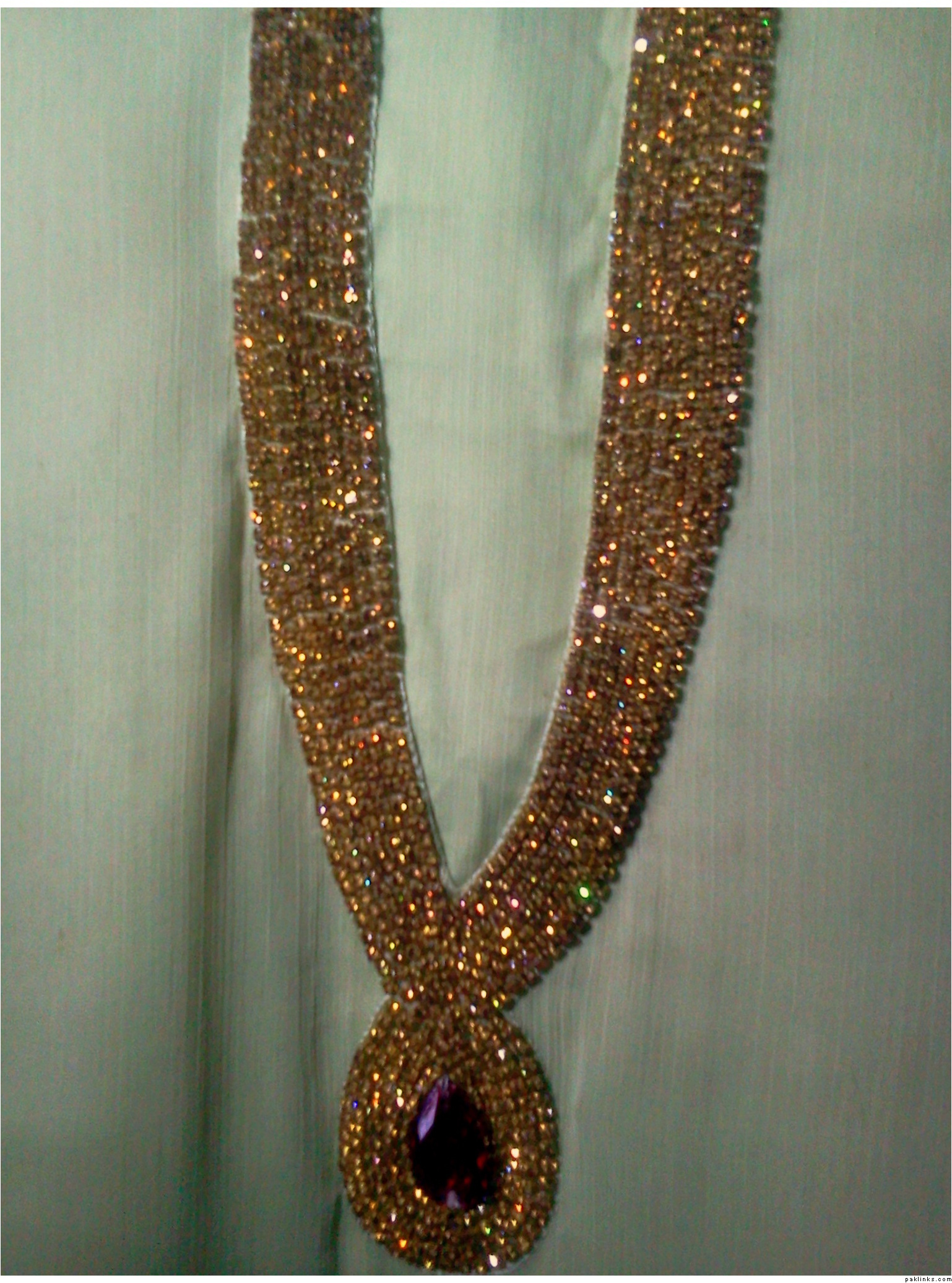 Work: Champagne colored diamondtese work with a drop shaped red crystal