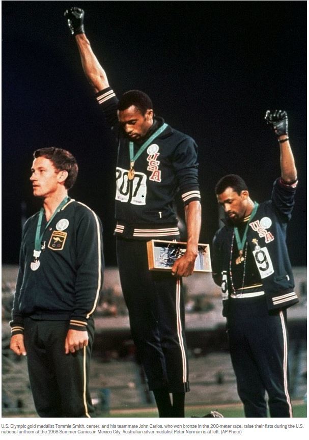 Reminds me of the Fist Raising in the Medal Ceremony during the National Anthem 1968 Olympics, brings awareness to the racial discrimination and oppression!