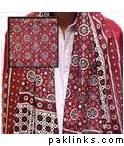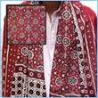 The Ajrak is an essential part of the apparel of a Sindhi person. Men use it as a turban, a cummerbund and wound it around the shoulders. Women use it as a dupatta and chaddar, as a shawl and sometimes as a makeshift swing for children. The Ajrak is usually about 2.5-3meters. It is patterned in intense jewel like colors. The dominant colors are rich crimson and a deep indigo. A little bit of white and black is also used to give definition to the geometric patterns.