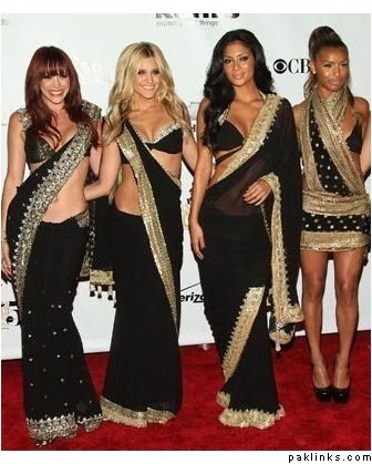 ^^Me too, dunno y they use models that pale. A tan, even a slight one always looks far far far better with a sari. Do love the pink outfit one the blonde girl is wearing tho. Aussie model Tania Zaetta + the Pussycat Dolls. Nicole’s skintone with the black looks great I think.