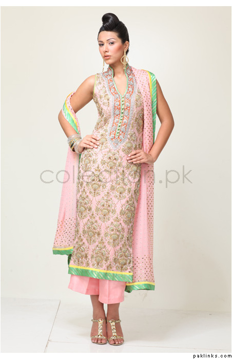 zigs, it was a sketch he did and then made it from scratch but maybe he used something else in his studio as inspiration? the kameez was long, in a medium-hued sort of grey-based pink, if that makes sense so not candy pink or red-based pink, and the lehenga was a lovely blue-based turquoise with a swirly sort of pattern on it in kaam. the dupatta was pink too. it was very nice shades of the colors- very fresh. i've seen the pink/blue combo before but not in these shades.