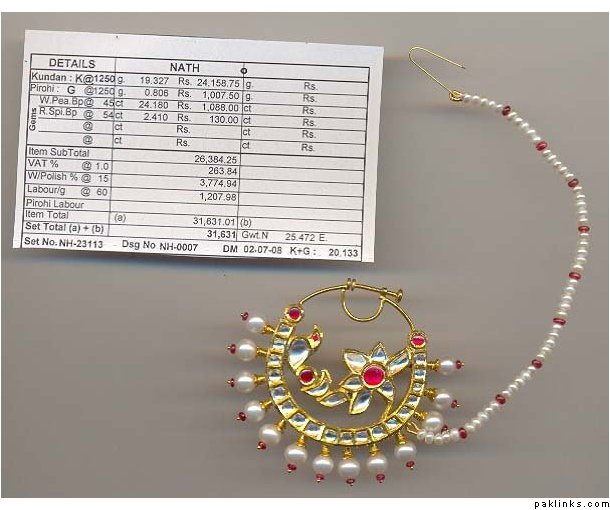 my friend wore one and it looked nice on her valima day it was a smal gold thick nose ring with pearls hanging off, but on her wedding day it was a thin large golden hoop with white and red beads at the bottom. I have to say that most ppl that took pictures with their digital cameras didn’t pick up the gold, it blended in with her face so it looked like she had a maroon, then two white spots and another maroon spot on her chin outta no where. THAT didn’t look good in the normal avg guests’ photos. So you may want to be careful if you go that route.