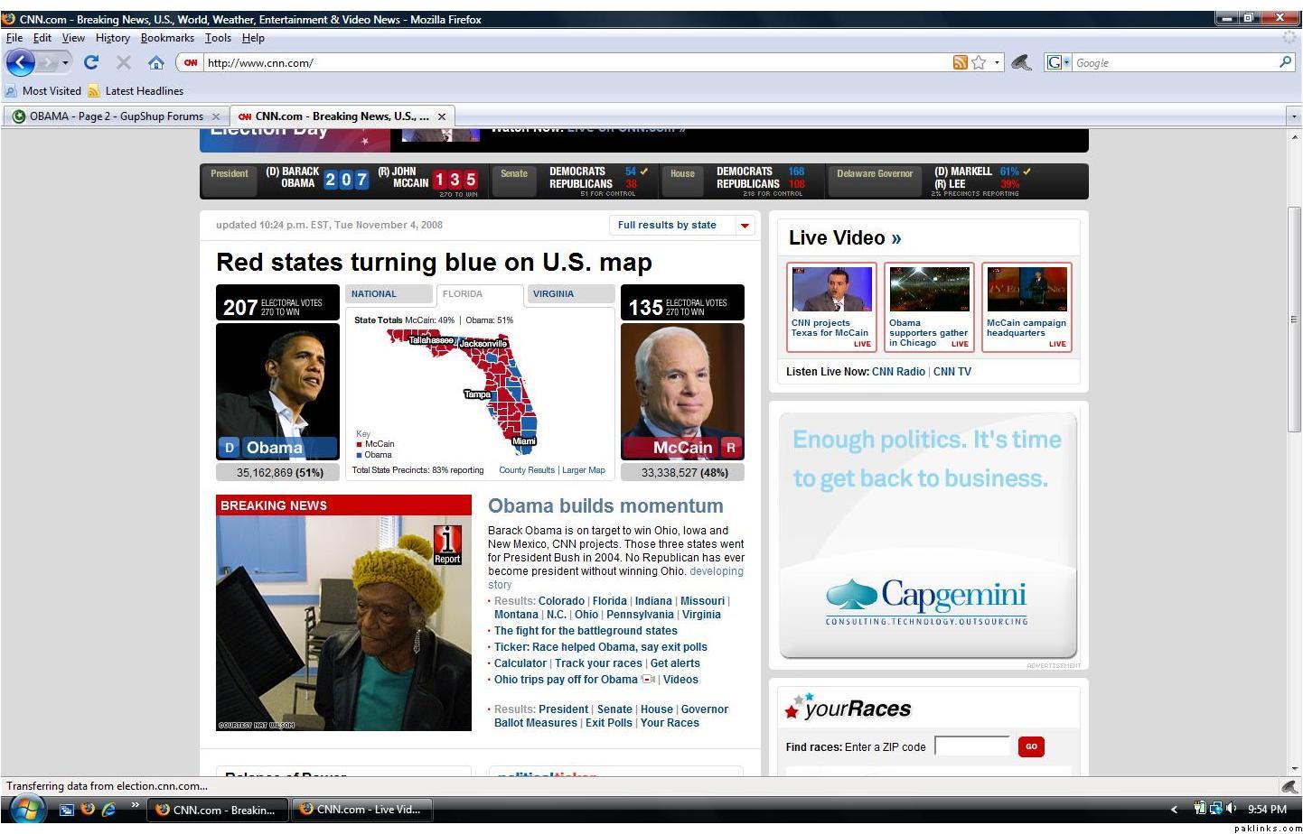 ok i dunno whats happenin in the cnn i have:S .. nayways barack obama is ahead in fl! .. 51% to 49! its tight:bummer: