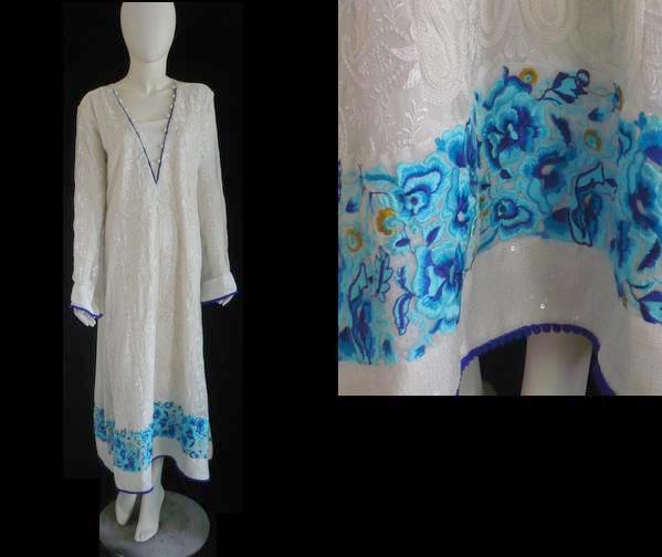Pic 1 : White self print in chiffon with blue patch in the border = 150$