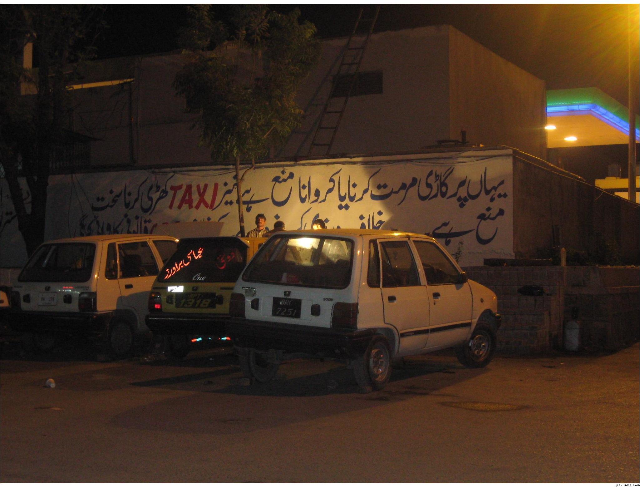 This picture was taken by me during my last trip to Pakistan. You can see that a taxi is parked in the middle and the car on the left is getting repaired. Then read what it says on the wall ![]()