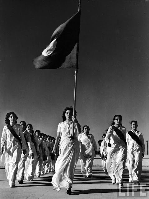 Pakistani members of the Sind Muslim Women’s National Guard practicing combat w. bamboo lathi sticks traditionally used by the Indian police