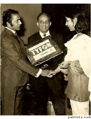 Legendary cricketer Hanif Mohammad is giving Tyfon award to Neelofer Abbasi. A tyfon executive is standing in the center.