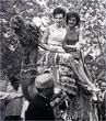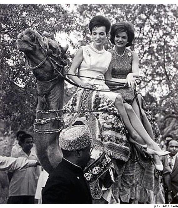 Jackie Kennedy wife of American President John F. Kennedy on a camel ride in Karachi with her sister Lee Radziville.