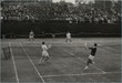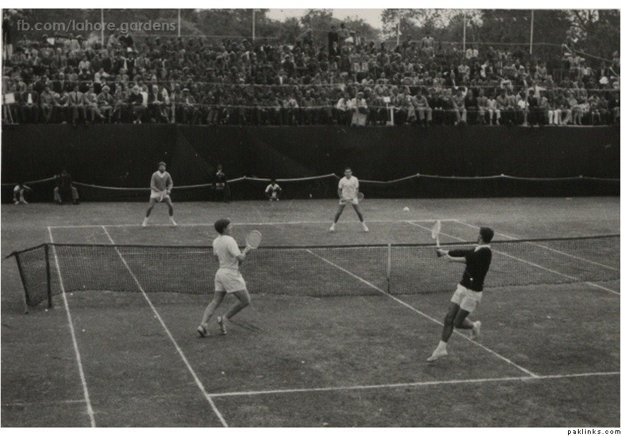 Lahore - 1958: The Doubles finalists, British lawn tennis players J.A. Pickard and W.A. Knight (near the camera), playing Ulrich (Denmark) and Legestein (Germany). The British pair won the title in Asian Lawn Tennis Championships held in Lahore