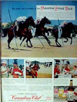 A press ad in a Pakistani magazine announcing the launch of Canadian Club Whiskey in Pakistan (early 1960s). The whiskey was first made available at Karachi’s horse racing and polo club (Race Course) and then introduced in the city’s many bars.