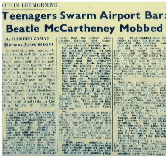 A newspaper clipping (from Pakistan’s daily, ‘Morning News’) with a report on how Pakistani pop fans gate-crashed their way into a bar at the Karachi Airport where the famous pop band The Beatles were having a drink. They had arrived in Karachi (1963) to get a connecting flight to Hong Kong. Between the 1960s and late 1970s the Karachi Airport was one of the busiest in the region.