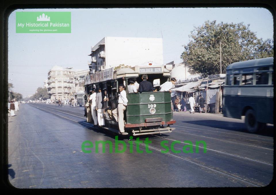 Tram is running on the street of Karachi in 1950s