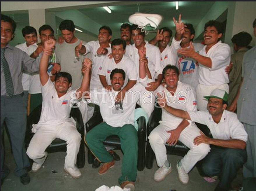 The Pakistan team celebrates after the amazing win by one wicket-Australia vs Pakistan 1st test Karachi 1994