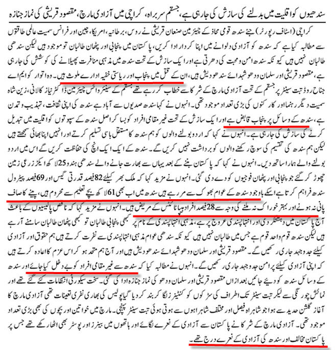Qureshi in his address not only demanded independence for Sindh, but said that Balochistan should also be recognised as a separate homeland and the Baloch as a distinct nation.