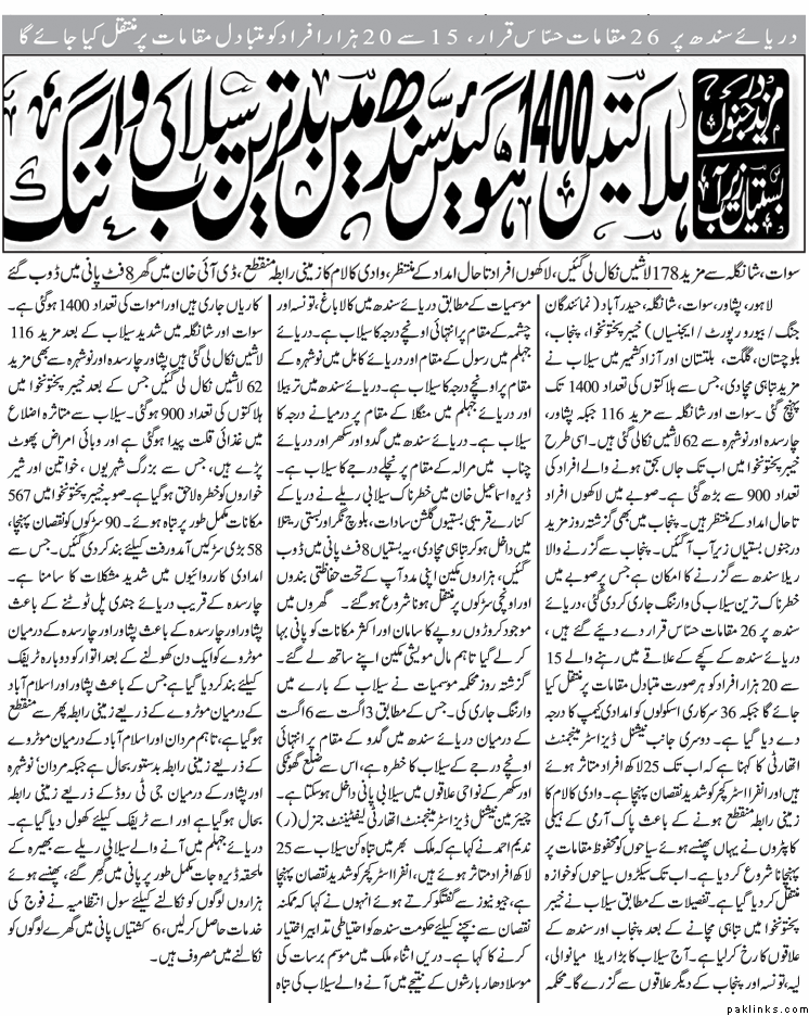 More than 1 million people at least 400,000[1]](http://www.paklinks.com/gs/#_ftnref1) of them children, have been affected by the floods, the worst the region has seen in decades. More than 1,000 people have died, with hundreds more reported missing, according to the Provincial Disaster Management Authority (PDMA) in Khyber Pakhtunkhwa.