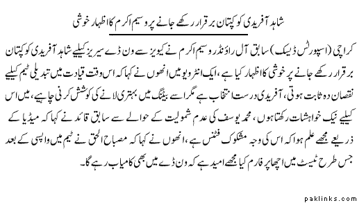The source confirmed that Afridi’s performance as captain in the upcoming six one day matches in New Zealand will determine whether he is appointed captain for the World Cup.